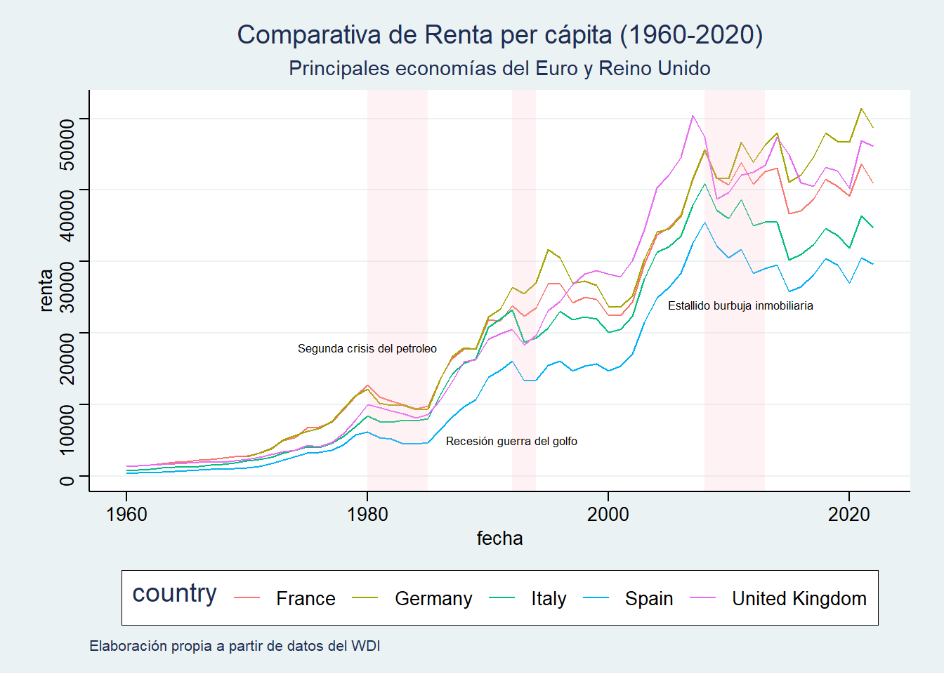 Para el siguiente gráfico nos hemos servido de los valores de renta per cápita extraidos en el ejercicio anterior. En este gráfico podemos observar la evolución del PIB per capita de los principales países europeos y cómo sus niveles de renta han ido variando con el paso del tiempo. Los shocks más importantes que ocurrieron durante el periodo de observación se han señalado mediante una franja roja y su correspondiente nombre. Resulta muy interesante ver como la enorme interdependencia de los países europeos les hace tener unas variaciones parecidas de la renta per capita ante los shocks económicos.